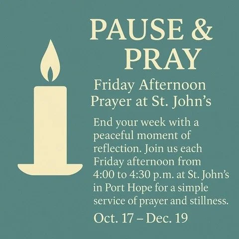 Friday Afternoon Prayer at St. John’s. End your week with a peaceful moment of reflection. Join us each Friday afternoon from 4:00 to 4:30 p.m. from October 17 through December 19 at St. John’s for a simple service of prayer and stillness. Led by both clergy and lay leaders, this is a time to pause, to be renewed, and to lift the needs of our community and world in prayer. Everyone is welcome.